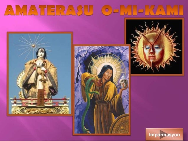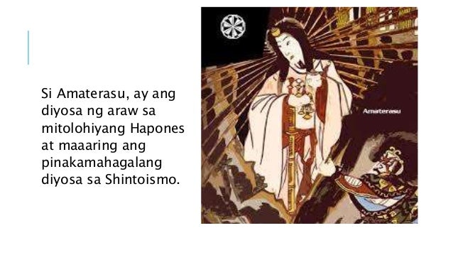 Lahat ng ito ay nakatawag-pansin kay Amaterasu na dumungaw at nakita ang sarili sa salamin. Ang ibang Kami ay lokal at maaaring ang mga espiritu o ang henyo ng isang partikular na lugar ngunit ang iba ay nagpapakita ng mas malaking bagay na natural at proseso. 15102014 Shintoismo ang tawag sa Paniniwala ng mga Hapones tungkol sa Diyosa ng araw at iba pang Diyosa ng kalikasan.
