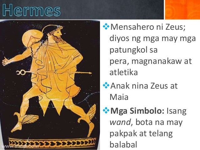 Isang kalapati mansanas kabibi at salamin 3. Diyos ng alak misteryo at teatro. Mensahero ng mga diyos Bihasa sa paglalakbay pangangalakal siyensiya pagnanakaw at panlilinlang.