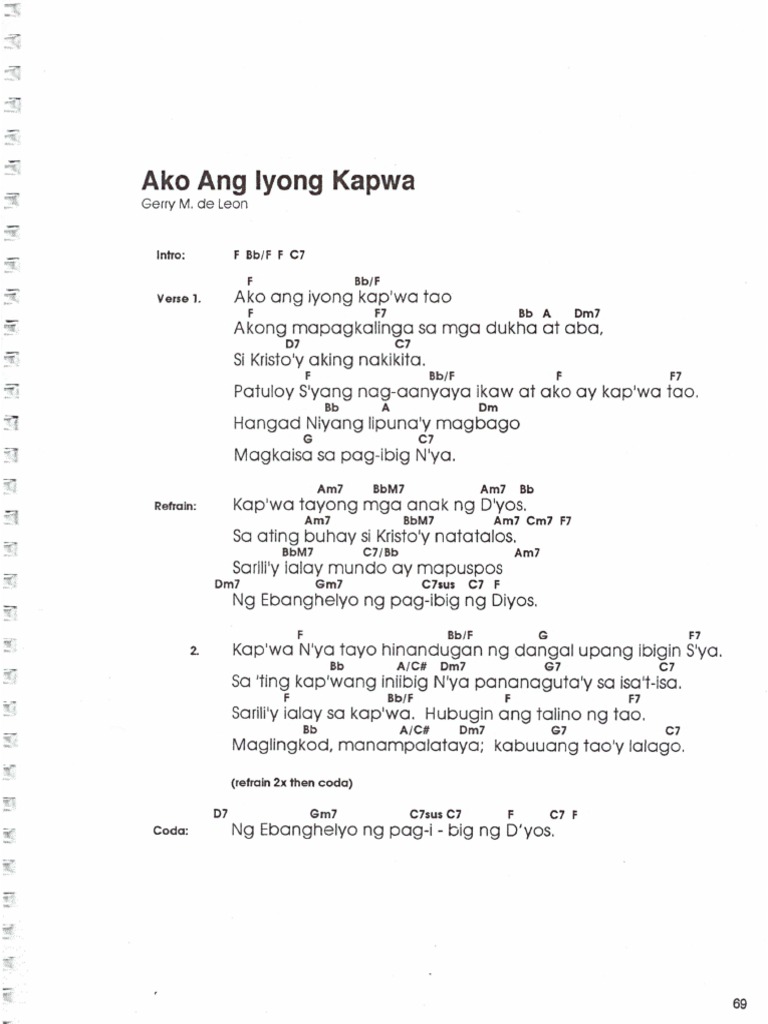 Ngunit kung tunay nga wagas at dakila Madarama namay kilig sa simula Sa gitna ay ngiti at duloy may tuwa Kung magmamahal ka ng tapat at akma. Kinikilala ng marami ang masigasig na pagtulong ng Iglesia Ni Cristo sa mga mahihirap at nangangailangan. Pag-ibig sa Kapwa Ikay tumunghay at igala ang paningin Munti mong daigdig sikaping palawakin Sa wari hindi mo nadarama man din.