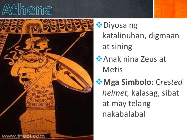 Diyos at diyosa ng roman mythology. Zeus Jupiter Pinuno ng mga Diyos sa Olympus. - Ang kanyang mga simbolo ay pana at chiton isang uri ng damit Athena Minerva - Diyosa ng karunungan sining industriya digmaan at katusuhan. Siya ang nangingibabaw pinakamakapangyarihan pinakamataas o supremong diyos ng sinaunang mga Griyego.