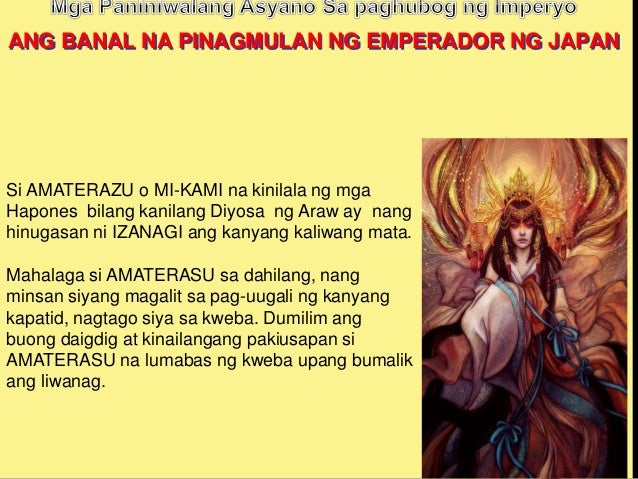 HttpsmmetlkingdomsalvationrefYT--JJ-0JOMAraw-araw na mga Salita ng Diyos Ang Pangit. Sinasabi na ang mga ninuno ng Hapon ay nagmula sa pagsasama ng Diyos na Izanagi at Izanami na nagakaroon ng anak na nagngangalang Amaterasu o Sun Goddess. Una ang ideya na ang lahi ng mga Hapones at ang kanilang lupain ang higit na pinapaboran ng diyos sa lahat ng mga bansa ay sumasalungat sa katuruan ng Bibliya na ang mga Hudyo ang lahing hinirang ng Diyos.