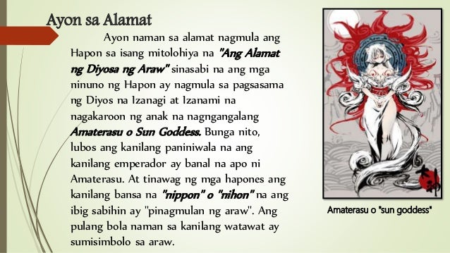 Diyos ng araw ng hapones. Ayon sa Alamat Ayon naman sa alamat nagmula ang Hapon sa isang mitolohiya na Ang Alamat ng Diyosa ng Araw. Kayo ay bansang itinalaga kay Yahweh. Kaya bagaman ang Shinto ay maaaring ang daan ng mga diyos sinasabi ng Bibliya na bagaman may tinatawag na mga diyos maging sa langit o maging sa lupa kung paanong maraming mga diyos at maraming mga panginoon sa ganang atin naman ay may iisa lamang Diyos ang Ama 1 Corinto 85 6 Tinutulungan ng mga Saksi ni Jehova ang libu-libo sa Hapn upang makilala ang iisang Diyos.
